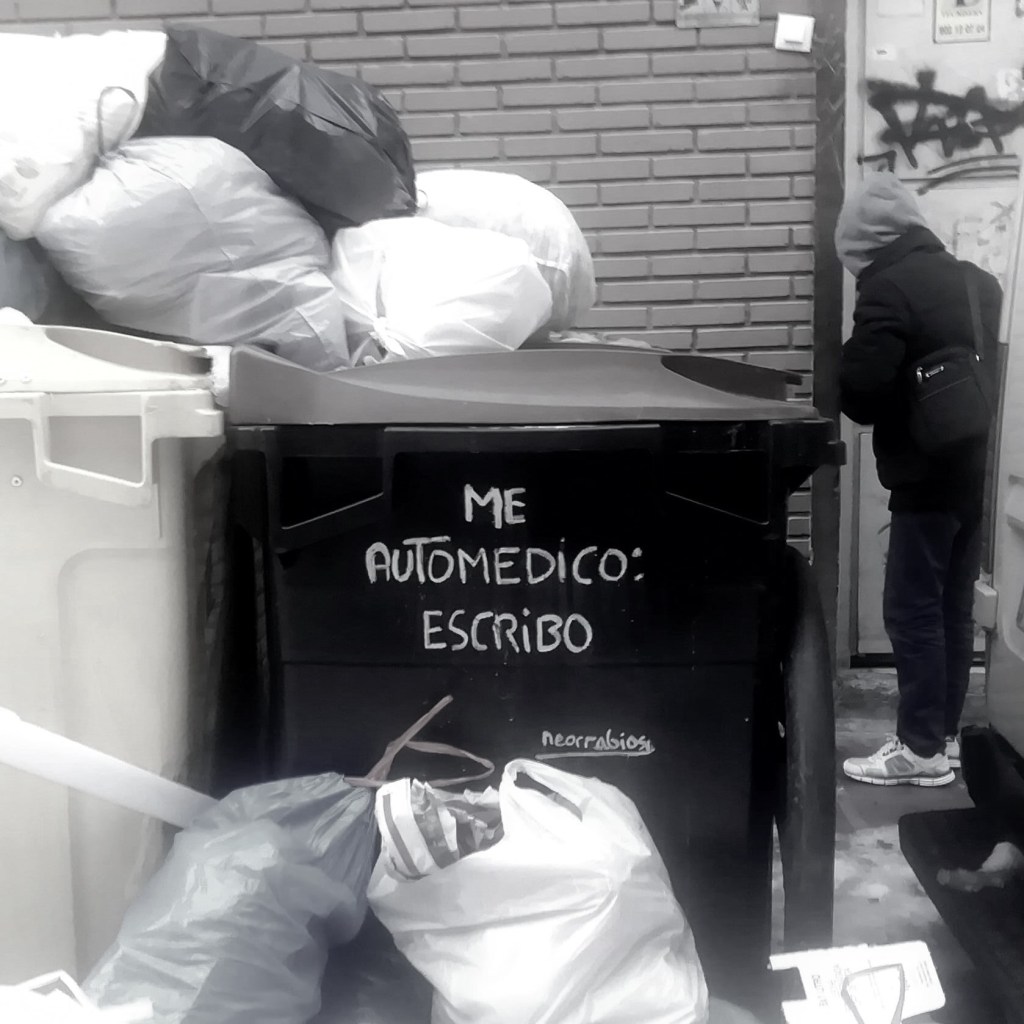 Stamattina ho avuto uno scambio di e-mail con Batania, il poeta (o la poetessa?) che è diventato noto sui social network per via di un’originalissima iniziativa artistica e poetica. Gli ho chiesto (o le ho chiesto?) di poter utilizzare alcune delle sue poesie o frasi come parte visuale per il numero tre della rivista, in uscita a giugno di quest’anno. Credo che la poesia urbana di Batania sia magnifica, aggiornata rispetto all’epoca in cui viviamo, i cambiamenti della città e della tecnologia. È una poesia che si articola attraverso frasi brevi, secche, a volte veri e propri aforismi lontani sia dai versi che dalla poesia narrativa. C’è anche visceralità, un populismo latente, un richiamo alla vita: qualcosa come un rock primitivo. Le sue frasi si possono trovare sui muri e i cassonetti della città di Madrid. Nelle ultime settimane, poi, uno sciopero dei netturbini ha reso visivamente la sua poesia ancora più impattante: tra cumoli di monnezza e sacchetti che invadono i marciapiedi i passanti possono dedicarsi anche solo un attimo di poesia, riflessione, introspezione. Mi piace, è una poesia di risveglio, diretta e profonda, si adatta bene anche alle regole della comunicazione contemporanea: perfette per un Tweet o per una foto su Instagram. Mi ha ricordato un po’ Antonio Porchia, il poeta calabrese emigrato da ragazzino in Argentina, e il suo libro di aforismi Voces; credo l’unico che abbia mai scritto. Vedo un modo nuovo di leggere dietro questa forma d’espressione, un approccio anti-libresco che mi auguro venga approfondito e non si disperda tra muri sozzi e insulse bacheche digitali. Proverò in qualche modo a dare un contributo con il numero tre di Grande Kalma. In futuro diventerà sempre più difficile leggere e la creatività fa, si evolve e si adatta, penetra tra le maglie strette della città e gli algoritmi che regolano il traffico della rete.